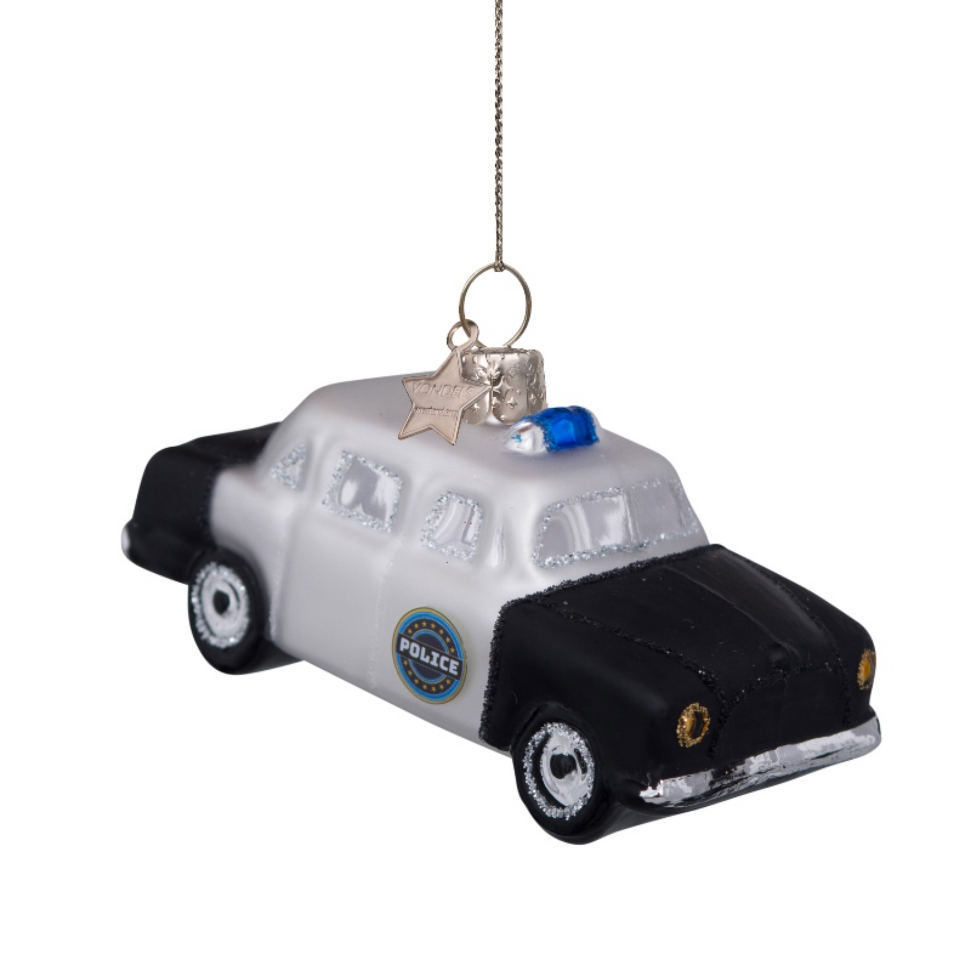 Amerikansk politibil ophæng i glas fra Vondels, alle er håndmalet samt mundblæst. Med de fineste detaljer, og kommer i alverdens figurer. Brug dem på juletræet, i vinduet, eller som en del af en dekoration, kun fantasien sætter grænser.