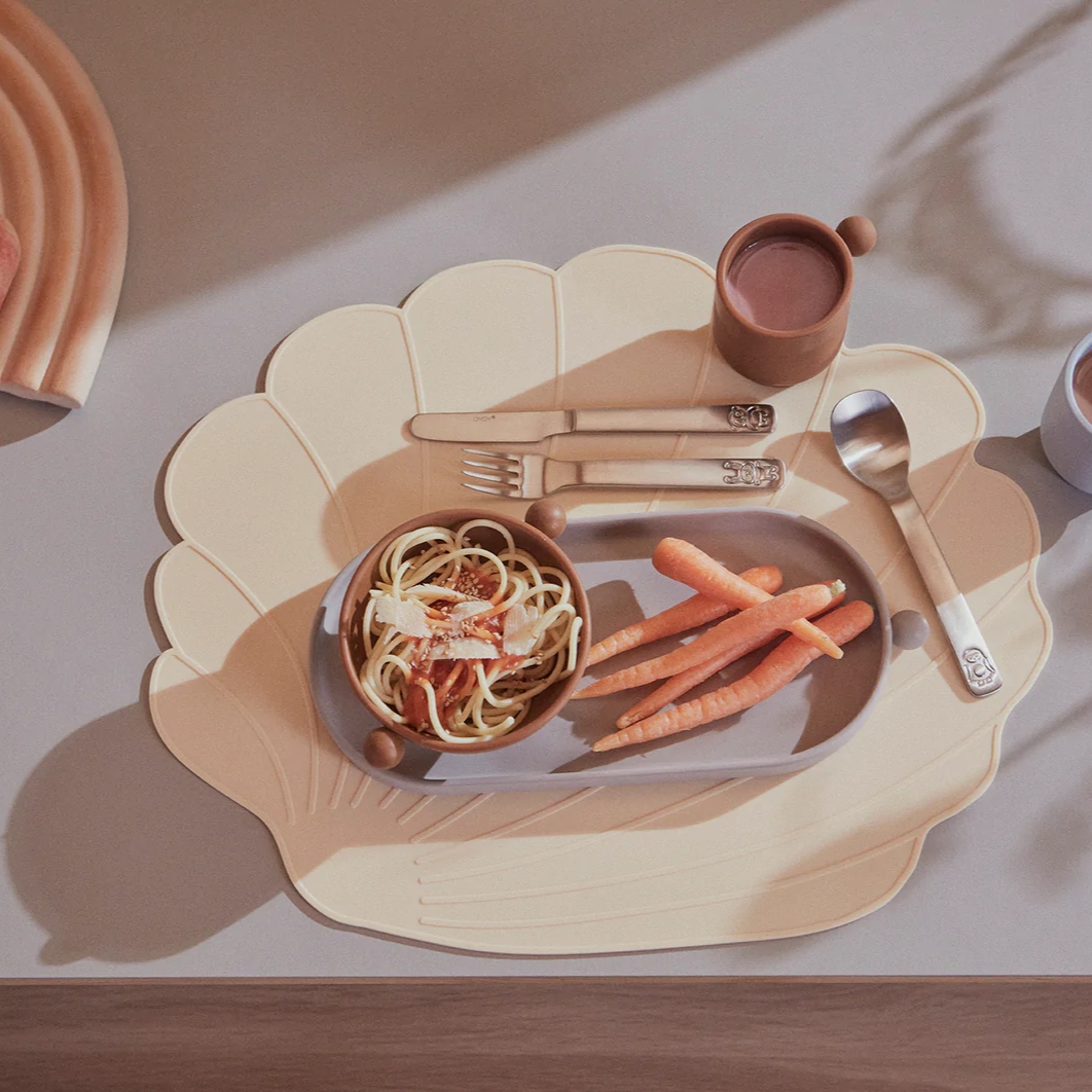 Sødt bestik i børstet stål med tre dyr indgraveret. Sættet består af en ske, gaffel og kniv.