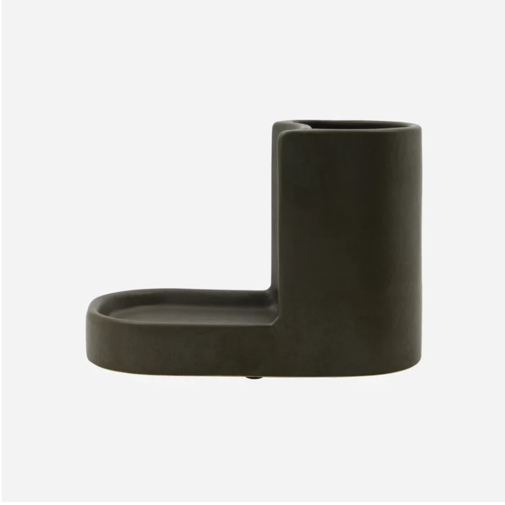 Skab et stilfuldt og roligt øjeblik ved håndvasken med denne elegante holder i mørkegrå keramik. Den funktionelle L-form med cirkulær cylinder organiserer dine plejeprodukter perfekt, mens den minimalistiske æstetik giver dit badeværelse et raffineret og sofistikeret udtryk. - Mat keramisk design. - Moderne minimalistisk form. - Praktisk todelt opbevaring. - Skaber hjemlig atmosfære. Forkæl dig selv med dette skulpturelle designobjekt, og transformér dit badeværelse til en oase af personlig velvære.
