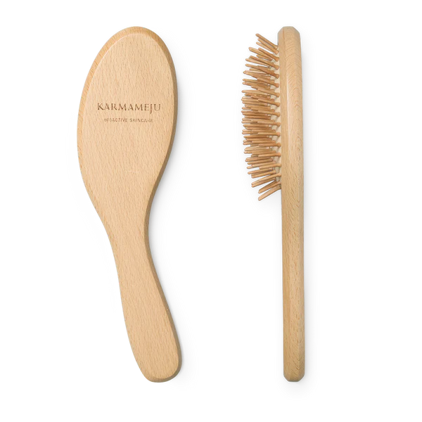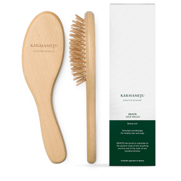 DEVOTE hårbørsten er i FSC-certificeret bøgetræ og med Karmamejus karakteristiske signatur-træskaft, der ligger godt i hånden, mens børstehovedets bløde pude lader træbørsterne glide nænsomt gennem håret.