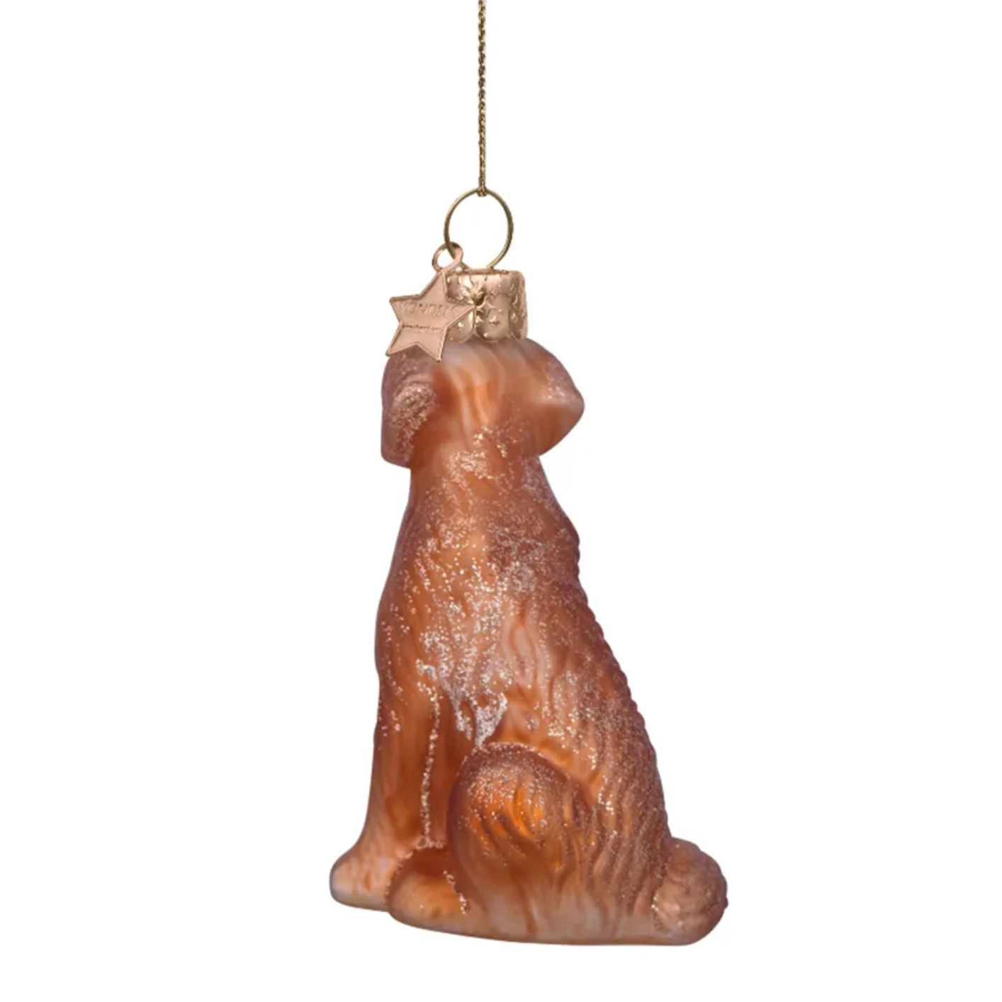 Guld retriever ophæng i glas fra Vondels, alle er håndmalet samt mundblæst. Med de fineste detaljer, og kommer i alverdens figurer. Brug dem på juletræet, i vinduet, eller som en del af en dekoration, kun fantasien sætter grænser.