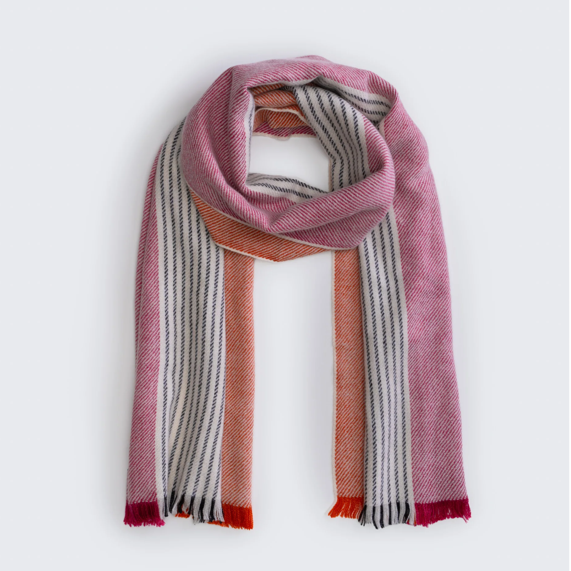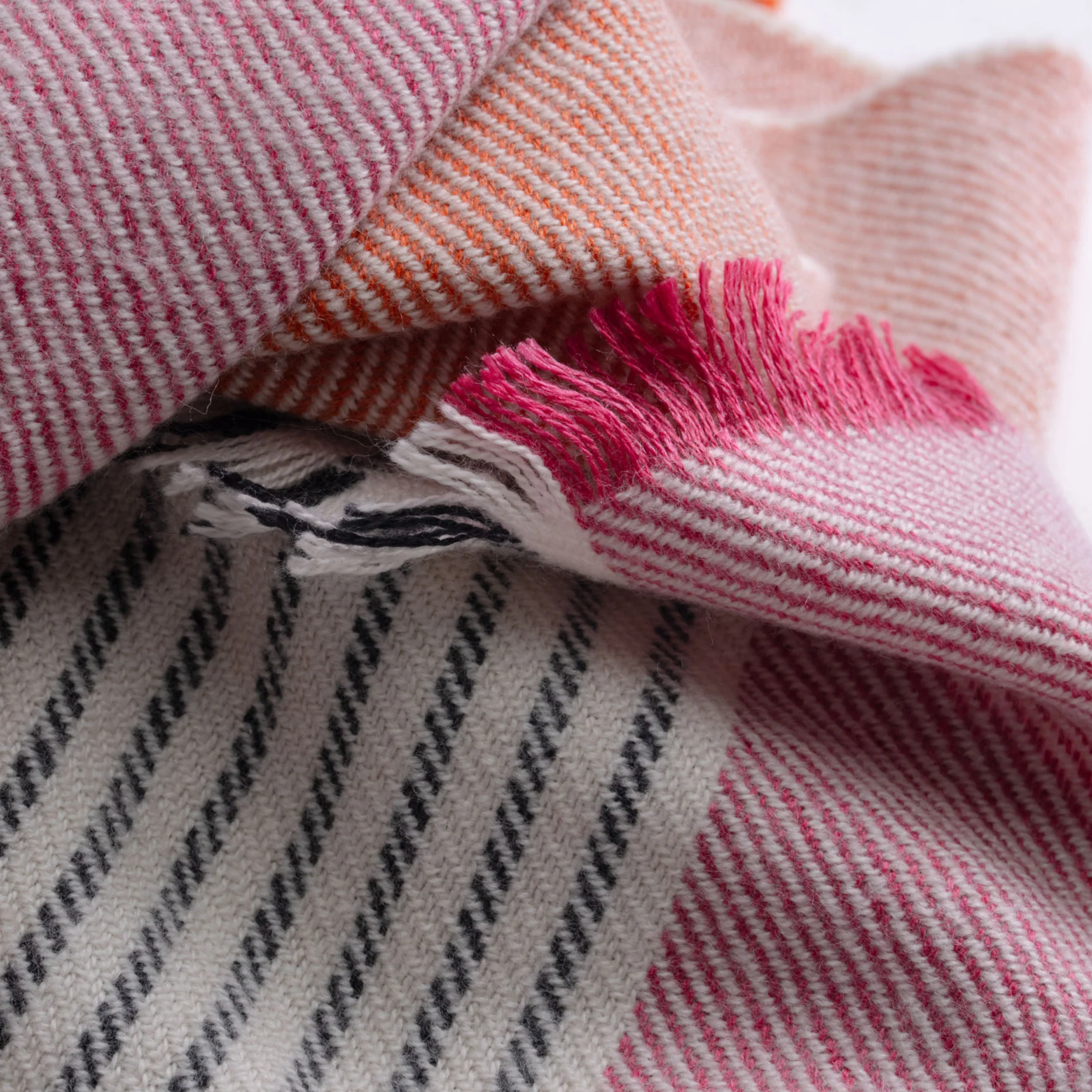 Mønsteret er enkelt i Vibeke Klints letgenkendelige farver, der kombinerer en kølig og en varm nuance med sort/hvide striber. Tørklædet er ekstremt blødt og varmt, vævet i 25% råsilke og 75% merinould.