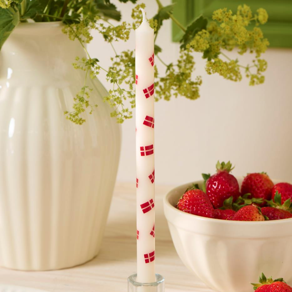 Højt og elegant kertelys med danske flag – perfekt til en festlig stemning. Kvalitetslys produceret i EU. Husk lysestagen, så det står sikkert og flot.