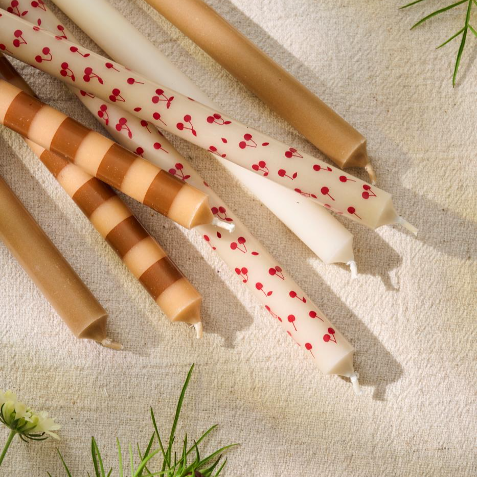Højt og elegant kertelys med kirsebær i en frisk rød farve. Kvalitetslys produceret i EU. Perfekt til både hverdag og fest. Husk lysestagen, så det står sikkert og flot.