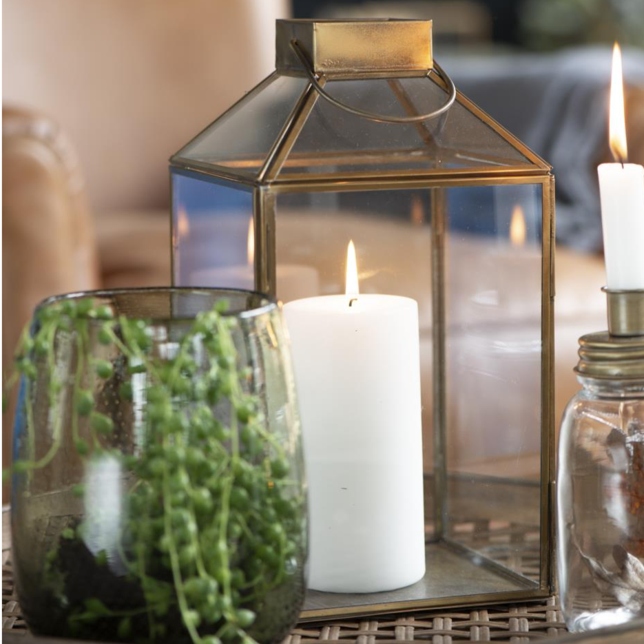 Klart glas på alle sider og top giver flot lys, mens toppens udluftningshul leder varme væk for en stabil flamme. Den antik messingfarvede ramme skaber et varmt udtryk, og den praktiske hank gør den nem at placere. Brug den med bloklys året rundt – og med en dekorativ lyskæde til jul.
