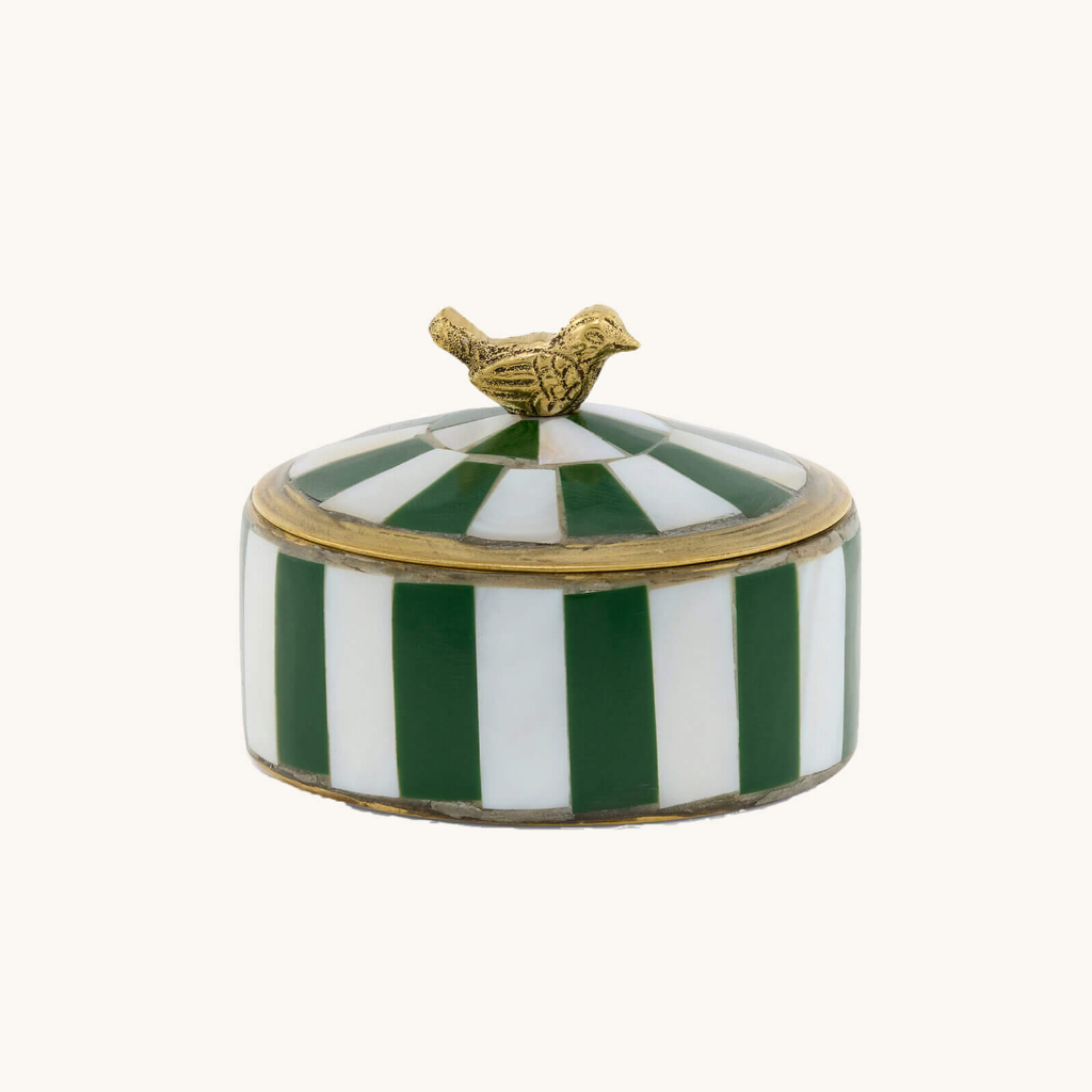 - Sustainable and stylish design: Flaunting a chic green and white color scheme with gold accents and charming bird detail on the clasp, the Jewelry Box Lola Green & White is a true statement piece. Its classic striped pattern fits seamlessly into various decor styles, adding a touch of refinement.