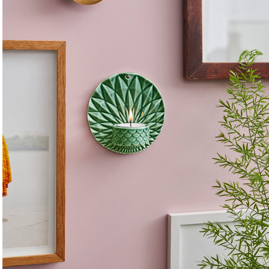 Pipanella væghængt fyrfadsstage i grøn er en elegant vægmonteret fyrfadsstage, der bringer varme og skønhed til dit hjem i de mørkere timer. Charlotte Adrian har designet denne smukke fyrfadsstage med indviklede mønstre inspireret af fiskeskæl og en rig grøn, transparent glasur, der reflekterer lyset på en betagende måde og kaster fortryllende skygger på væggen.