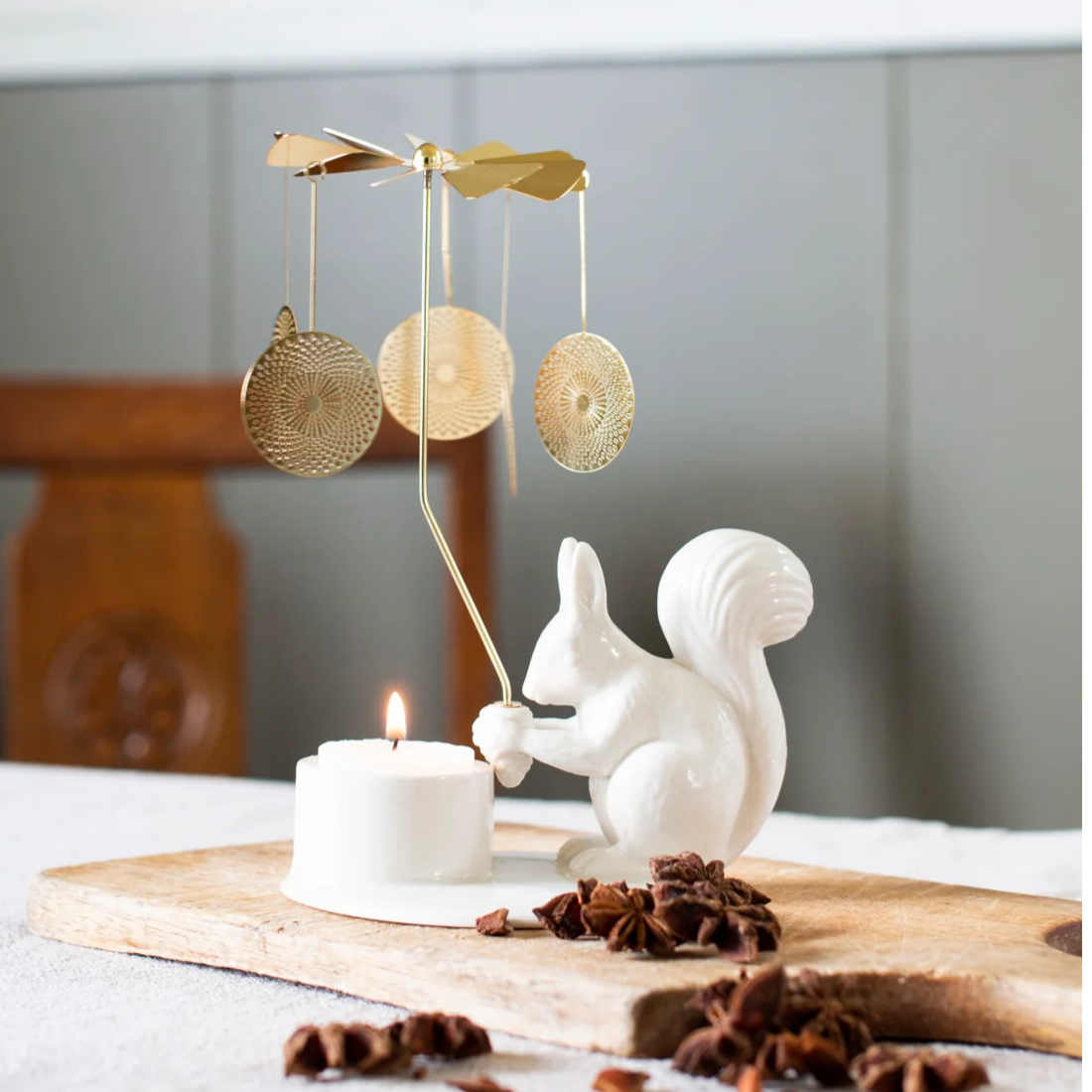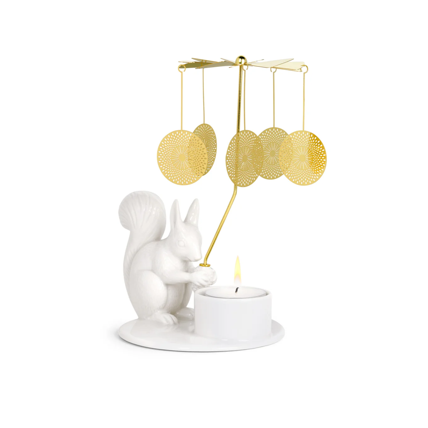 Winter Stories Egern med englespil er en charmerende og finurlig detalje til din vinteroppyntning, designet til at bringe legende elegance ind i dit hjem. Skabt af den anerkendte designer Thora Finnsdottir, viser dette charmerende design et smukt fremstillet porcelæns egern, der holder et gyldent englespil, som roterer lydløst, mens fyrfadslyset nedenunder flakker. Når lyset brænder, danser delikate lysmønstre rundt i din stue og tilføjer en magisk og rolig atmosfære.